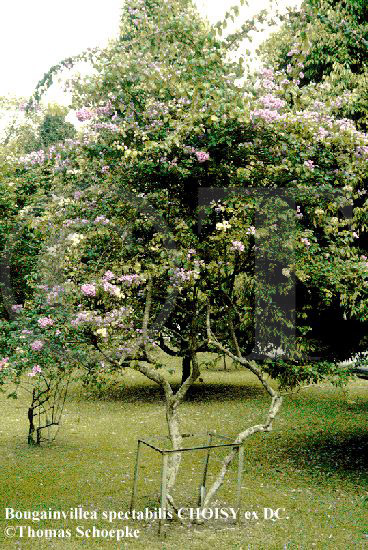 | Bougainvillea spectabilis CHOISY ex DC. (ganze Pflanze, Blütenstand mit den auffällig gefärbten Hochblättern) | (Blüte*: Kelch petaloid, kleine Hochblätter den Kelch vortäuschend) | (ganze Pflanze*, Blütenstand*, Blüte*) | ||