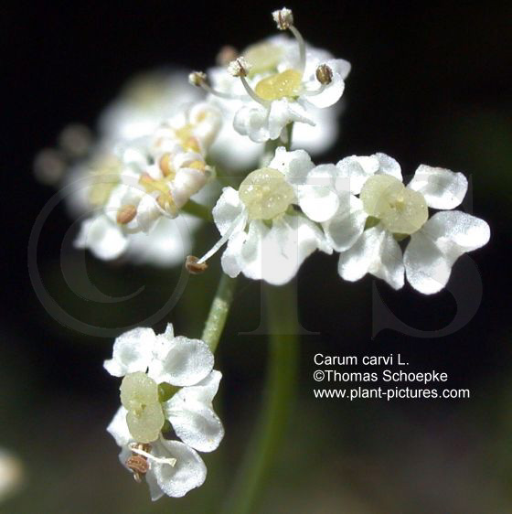 Stammpflanze: Carum carvi L. / [Fam. Apiaceae / Doldengewächse]. Synonyme: Aegopodium carum WIB., Apium carvi (L.) CRANTZ, Carum aromaticum SALISB., Carum decussatum GILIB., C. officinale S. F. GRAY, Carvi careum BUBANI, Foeniculum carvi E. H. L. KRAUSE, Karos carvi NIEUWLAND et LUNELL, Lagoecia cuminoides WILLEMET [ex DC.] nec. L., Ligusticum carvi RÖTH, Pimpinella anisum MEIGEN et WENIGER nec. L., Seseli carum SCÖP., Seseli carvi LAM., Sium carum WEBER, Sium carvi BIEB.. Dt. Synonyme: Wiesenkümmel, gewöhnlicher Kümmel, gemeiner Kümmel, echter Kümmel, Krammkümmel, Karve, Garbe. Englisch: caraway, carwey, cumin. |