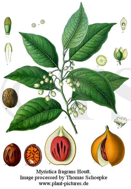Stammpflanze: Myrstica fragrans HOUTT. / Muskatnussbaum [Fam. Myristicaceae / Muskatnussgewächse]. Synonyme: Myristica amboinensis GANDOGER, Myristica americana ROTTB., Myristica aromatica LAMK., Myristica aromatica SWARTZ, Myristica moschata THUNB., Myristica officinalis L., Myristica philippinensis GANDOGER. Dt. Synonyme: Moschatenbaum. Englisch: Banda nutmeg, mace, nutmeg tree. |